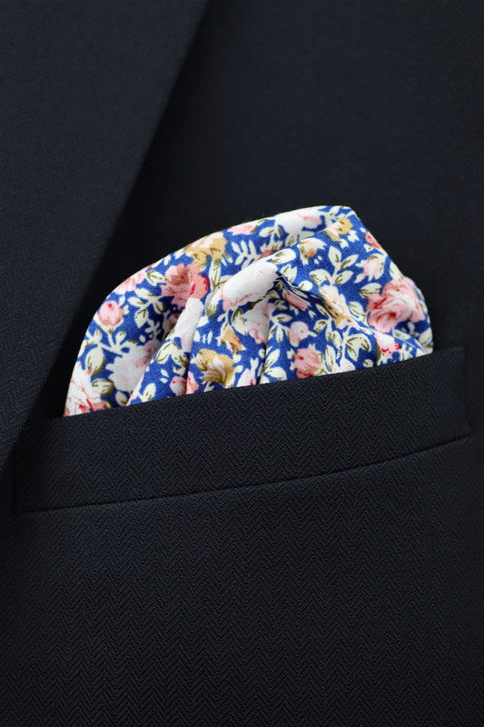 100% Cotton Floral Print Pocket Square - Navy Blue & Pink