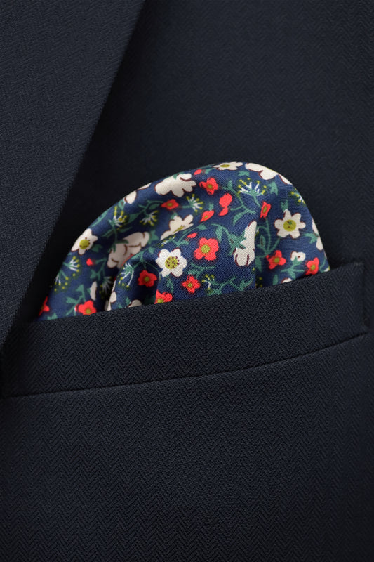 100% Cotton Floral Print Pocket Square - Navy Blue, White & Red