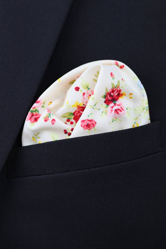 100% Cotton Floral Print Pocket Square - Cream & Pink